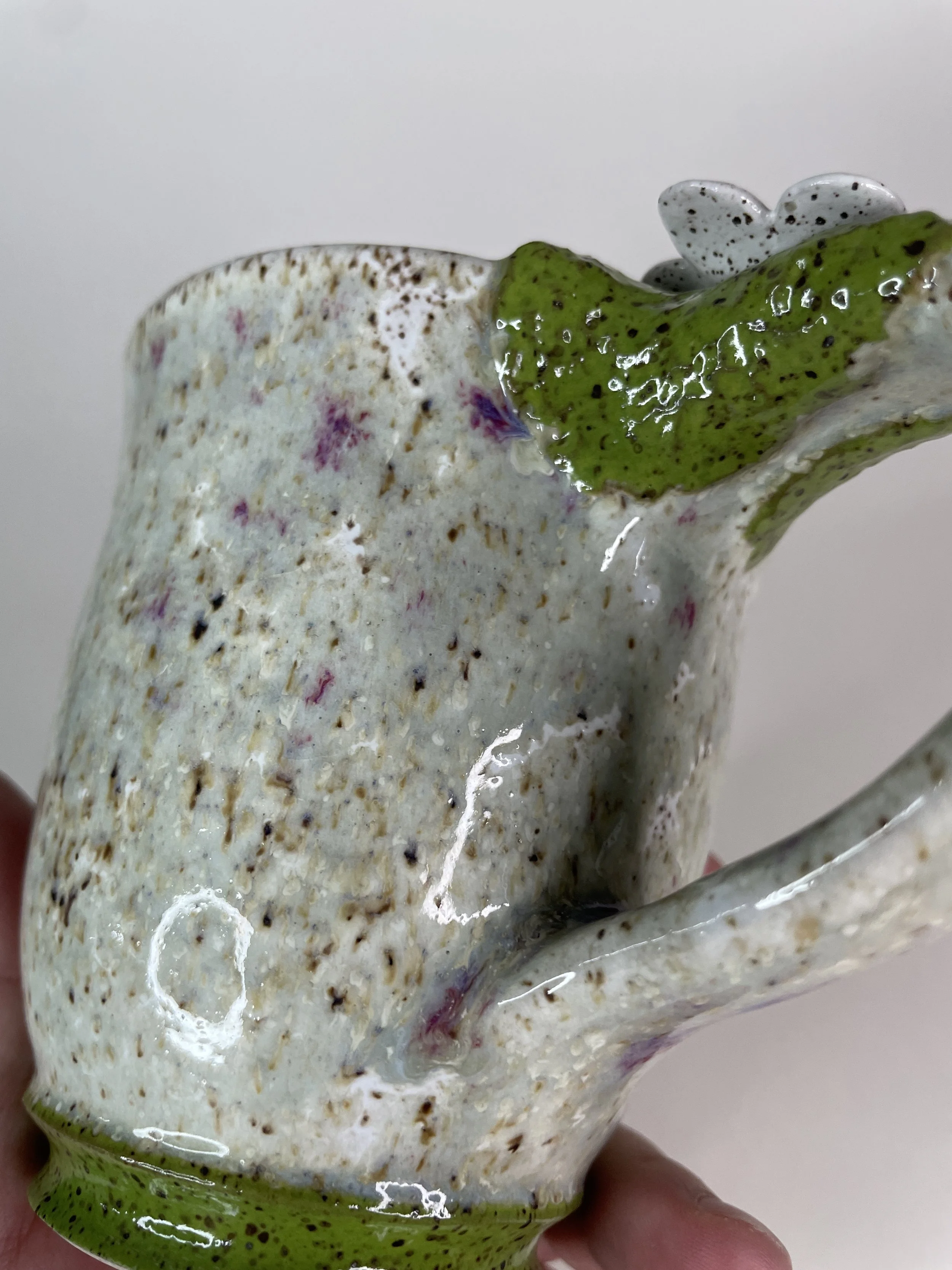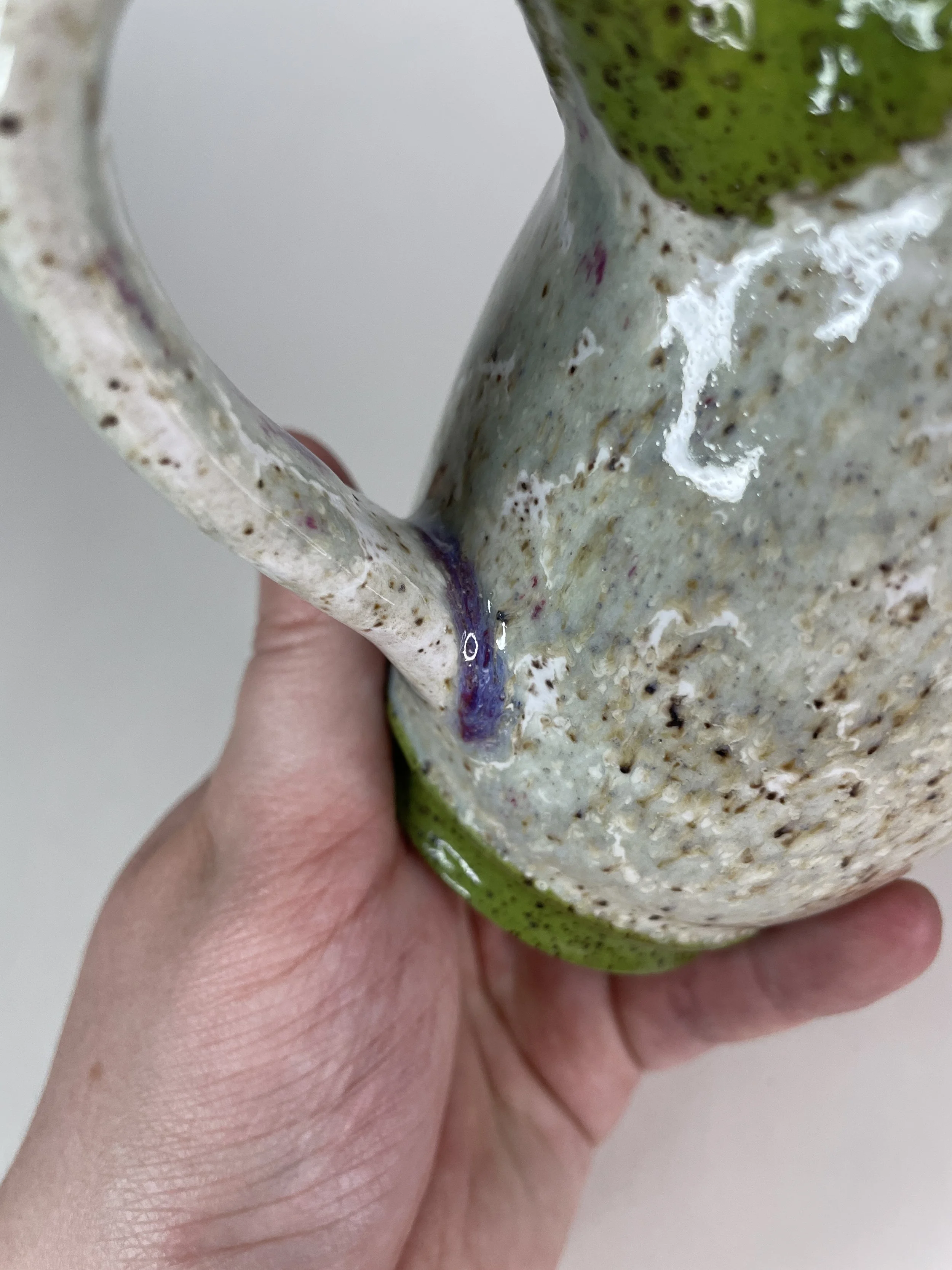 The deep green glaze has slight speckling due to elements in the clay itself. There is soft pink flashing in various places due to the somewhat chaotic nature of the firing process. It adds a special visual interest that makes viewing this piece from all angles quite satisfying.